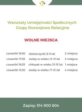 Uwaga wyjątkowa okazja, możemy zaprosić jeszcze pojedyncze osoby do danych grup. Grupy rozwojowo relacyjne, więcej informacji tutaj. Warsztaty Umiejętności Społecznych, więcej informacji tutaj,